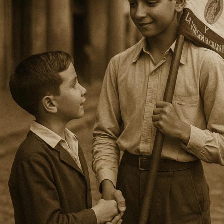 Entre los recuerdos de mi niñez lo que tengo más grabado, como si hubiera sido una visión sobrenatural, es la presencia de José Luis. Al llegarme a él para conocerlo, estrechaba contra su corazón la Bandera de Cristo Rey, y con fervor extraordinario hablaba de la Madre de Dios a un joven cristero desalentado, tratando de infundirle entusiasmo para ser fiel a sus compromisos de soldado de Cristo. Me acerqué a él, y obedeciendo a un impulso que no pude contener, le dije: -José Luis, quiero ser como tú, soldado de Cristo Rey. Quiero ir contigo para llevar también yo esa Bandera.